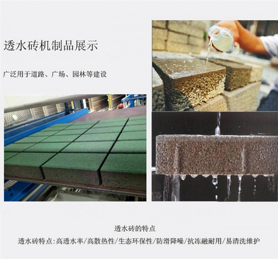 我厂是一家生产透水砖机、透水砖制砖机、透水砖生产设备,性能稳定,质量可靠,以独特的液压加振动系统生产各种产品,用于公园、广场、路面美化,道路建设等,既美观而且透水性好,是国家海绵城市建设必不可少的设备。