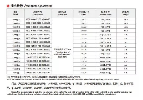 ⽤途:产品型号以碾磙直径为代号。φ1500型、φ1400型号、φ1350型、φ1300型号湿碾机可供选铁、钼锌、铅、锑等矿使⽤。φ1200型、φ1100型、φ900型、φ850型可供使⽤选⾦使⽤。
