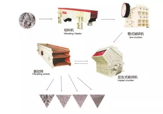 1、振动给料机+颚式破碎机+反击式破碎机+⽪带输送机+圆振动筛;